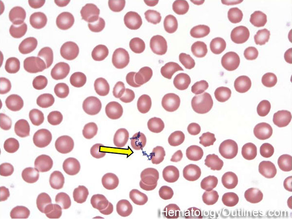 The contaminating bacteria are usually cocci (dark blue round structures much smaller than the RBC)
