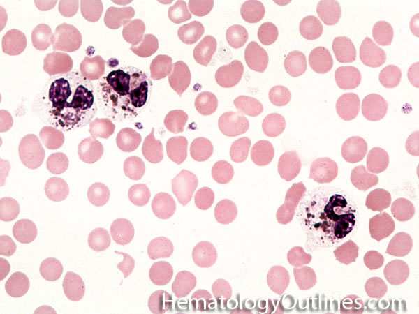 Neutrophils | Also known as PMN (for polymorphonuclear), it belongs to the myeloid (granulocytic) cell lineage. neutrophils usually increase in blood secondary to infection (esp. bacterial). As opposed to eosinophils and basophils, the granules in neutrophils are neutral (light pink) in color.