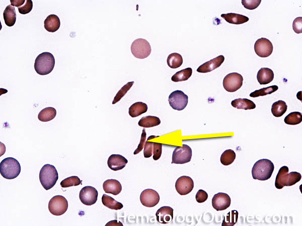 Ovalocytes | Also sometimes referred to as elliptocytes are RBCs with an elongated or oval shape and may be secondary to hereditary elliptocytosis or iron deficiency anemia to name a few.