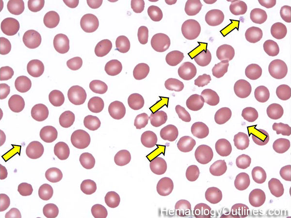 Reticulocytes | Reticulocytes are immature RBCs that do no contain nuclei but have increased amounts of RNA. On normal peripheral blood smears stained with Wright-Giemsa they appear as polychromatophilic cells (light purple/blue cells are the polychromatophilic cells versus the more mature RBCs stain pink/red) and with special stains (such as supravital stain) one could highlight the excess RNA within the cytoplasm of these RBCs known as reticulocytes. Normal range for reticulocytes in the peripheral blood is 0.5-1.5%. Increased reticulocytes can be seen in the setting of anemias that are due to desctruction of RBCs (such as in autoimmune hemolytic anemia) which causes the marrow to increase production of newer RBCs. Low recticulocytes are usually indicative of marrow underproduction and can be caused by chemotherapy, aplastic anemia, pernicious anemia, bone marrow malignancies, vitamin and mineral deficiencies, Chronic diseases, or lack of erythropoietin production.