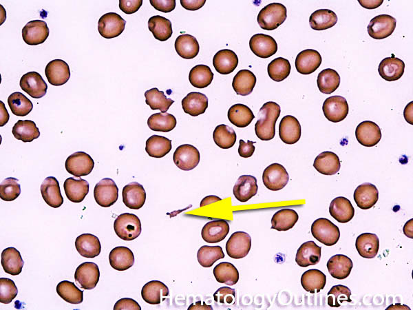 Schistocytes | These are irregularly shaped assymetrical fragmented RBCs that may have several morphologic forms (e.g. Helmet cells, etc.). It is usually the result of mechanical disruption of the RBCs and many of which are generated by getting stuck to fibrin strands within the vessel wall (intravascular destruction) which may be secondary to a Microangiopathic hemolytic anemia such as HUS, TTP and DIC or a fibrin-independent destructive path such as being broken up by a mechanical heart valve.