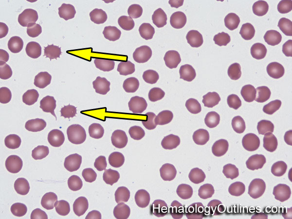 Acanthocyte | Also known as Spur Cell is an RBC with irregular thorn-like projections. Looks like "Cowboy Boot Spurs". These RBCs may be seen in some peripheral smears due to artifacts or may be associated with certain conditions including Abetalipoproteinemia, Liver disease, Malnutrition, Hypothyroidism, Asplenia, and McLeod Phenotype of Kell blood group, etc.